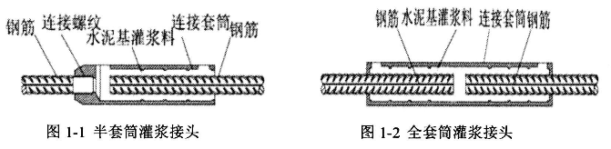 國(guó)內(nèi)外已有很多套筒灌漿接頭,且其形式多種多樣,但是按照套筒的形式,總體上可分為全套筒灌漿接頭和半套筒灌漿接頭兩大類,全套筒灌漿接頭的兩端均采用灌漿方式連接鋼筋(見(jiàn)圖1),其適應(yīng)性廣,是目前最廣泛的一類套筒灌漿接頭形式,半套筒灌漿接頭(見(jiàn)圖2)其在預(yù)制構(gòu)件端接頭一般采用直螺紋方式連接鋼筋,現(xiàn)場(chǎng)裝配端采用灌漿方式連接。工業(yè)上常用的套筒主要是Nisson Masters(簡(jiǎn)稱NMB)連接套筒和LENTONINTERLOCK。表1-1是25mm直徑鋼筋套筒灌漿接頭產(chǎn)品參數(shù)比較。