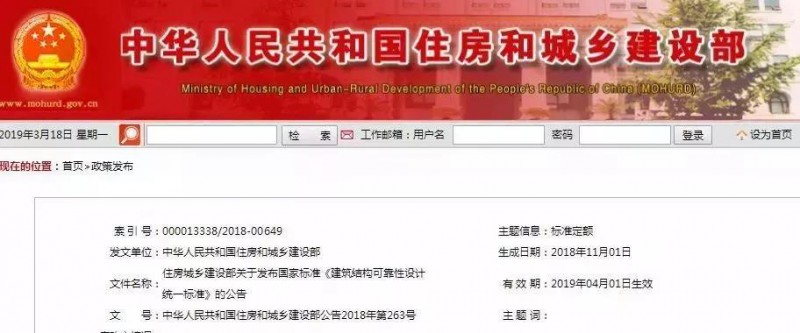 住房城鄉(xiāng)建設部在2018年11月發(fā)布了關于國家標準《建筑結構可靠性設計統(tǒng)一標準》的公告,批準《建筑結構可靠性設計統(tǒng)一標準》為國家標準,并自2019年4月1日起實施。