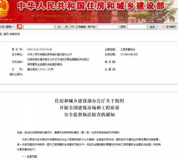 5月20日,從住建部官網(wǎng)獲悉,為進一步規(guī)范建筑市場秩序,提升工程質量安全和建筑節(jié)能水平,住建部決定在全國統(tǒng)籌開展建筑市場和工程質量安全監(jiān)督執(zhí)法檢查。檢查分兩批進行,時間分別為2019年5月和9月,第一批檢查北京、天津、河北等省,第二批檢查江西、山東、河南等省。
